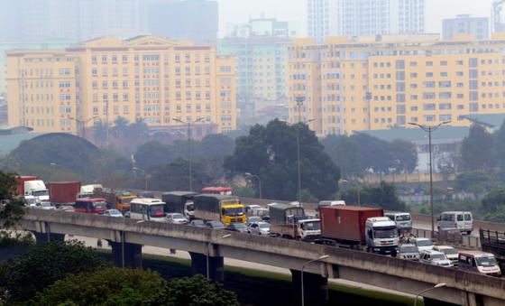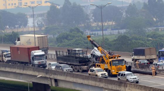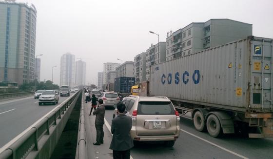 Vụ tai nạn xảy ra đã khiến đường trên cao ùn tắc kéo dài khoảng 5km theo hướng từ Pháp Vân về cầu Mai Dịch.