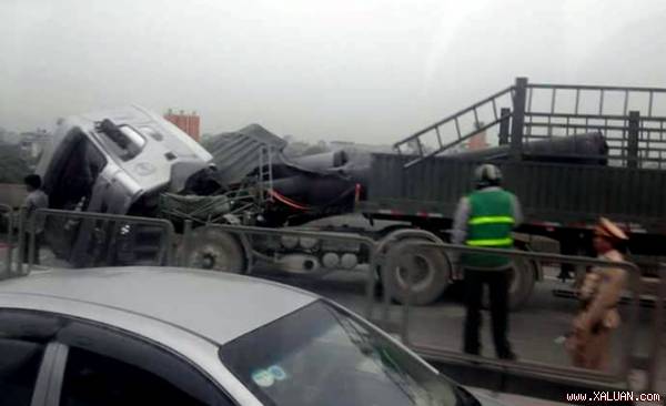 Hơn 3h sáng 28/3, chiếc xe đầu kéo chở ống có kích thước lớn chạy trên đường vành đai 3 trên cao (Hà Nội) theo hướng về Mai Dịch, khi đến đoạn gần trường Đại học Dân lập Thăng Long đã va chạm với xe cẩu.